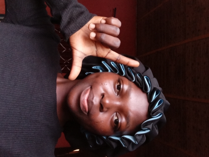 A woman with dark skin and a black bonnet with light blue trim smiles slightly, looking directly at the camera. Her left hand is raised and angled above her head, forming a right angle with her fingers. She wears a long-sleeved, dark, ribbed shirt. The background is a mix of dark brown and red, with vertical patterns on the right side. The image is rotated, with the subject tilted to the left.