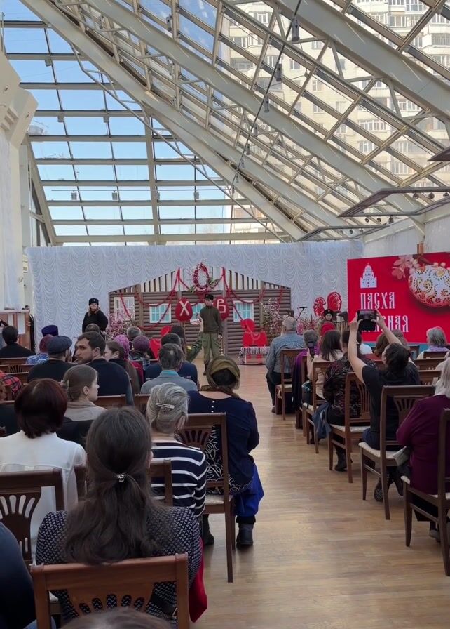 An eye-level, medium shot shows a large group of seated people watching a play, or possibly a presentation, taking place on a stage. The audience members, mostly appearing to be middle-aged or older adults, are seated in rows of wooden chairs. Many are casually dressed in sweaters, striped shirts, and dresses. Some are looking toward the stage. One person on the right side of the frame is holding up a phone to take a photo or video. The stage is decorated with a backdrop that resembles a rustic wooden house with white trim. Large decorative Easter eggs, marked with the letters "ХВ" in red, flank the stage. Other decorations include a wreath, red beaded garlands, and two red wooden rocking horses. A man dressed in a military-style uniform and a black beret stands in the center of the stage, holding a small silver object in his hand. Another person in a black robe is standing on the left side of the stage. A screen on the right side of the stage displays an Easter egg design. The venue appears to be an indoor space with a high, slanted glass roof, allowing natural light to flood the room. A multi-story building is visible through the glass roof.