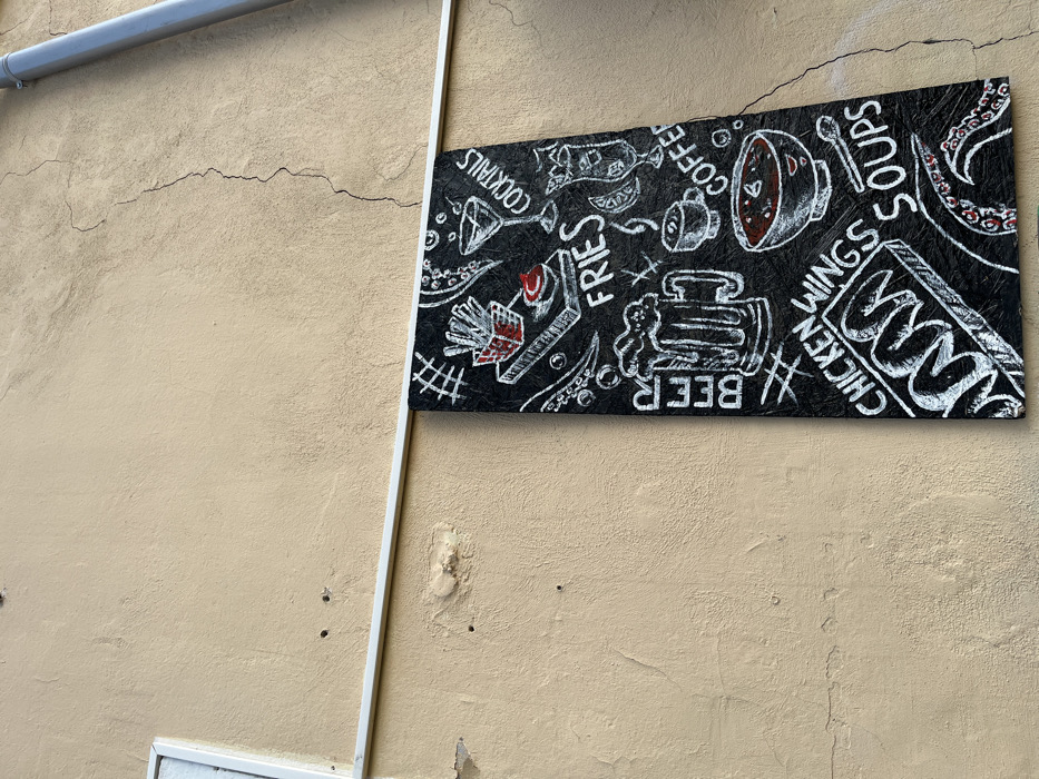 A sign for a restaurant is mounted on a textured beige wall. The sign is black with white chalk-like illustrations and text. It lists various menu items: cocktails, coffee, soup, fries, beer, chicken wings. A metal pipe runs along the top left of the wall. The wall shows cracks and imperfections, suggesting age and exposure to the elements.