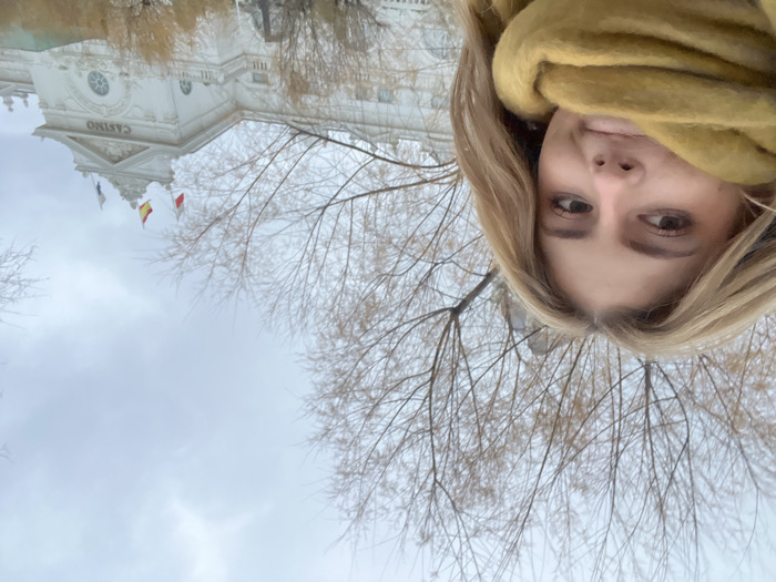 A young woman's head and shoulders occupy the left foreground of the image, angled slightly to her right while looking towards the camera. She has light brown hair and is wearing a thick, mustard-yellow scarf wrapped around her neck and lower face. Behind her and to the right, partially obscured by bare deciduous trees with numerous fine branches, stands the Gran Casino del Sardinero in Santander, Spain. This large, ornate white building exhibits classical architectural features, including a pedimented facade with the word "CASINO" inscribed above a central circular window. Three flags are visible atop the casino's roof; from left to right, they appear to be the French flag, the Spanish flag, and a third less distinct flag. The sky is uniformly overcast and light grey.