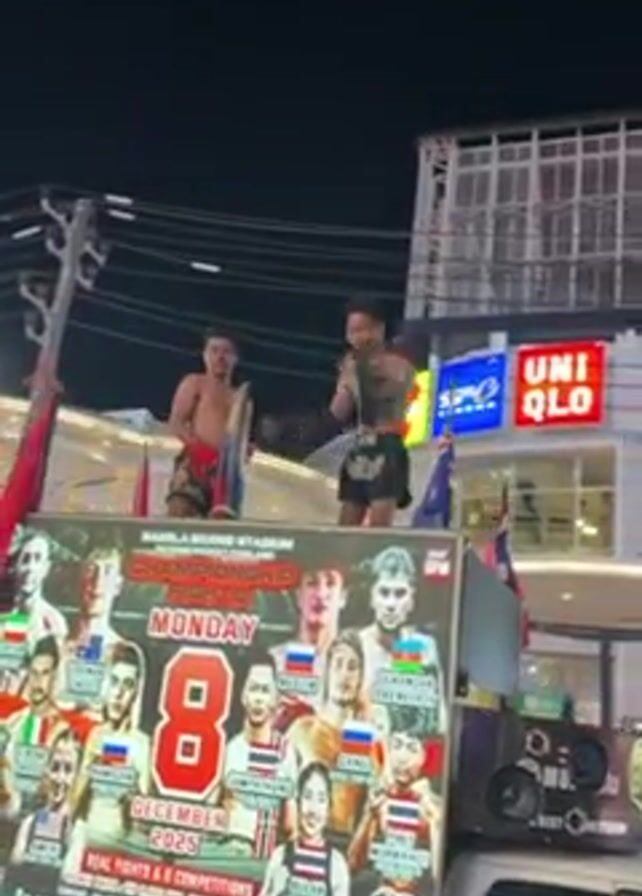 two shirtless men wearing boxing shorts on top of a white truck at night, with a large advertisement for a Muay Thai boxing match on the side of the truck. The men are sparring with gloves and pads. The advertisement features numerous fighters and indicates the event will be held on Monday, December 8, 2025, at Bangla Boxing Stadium. The area is brightly lit with streetlights and storefronts visible in the background, including a UNIQLO store. People are seen standing and observing the men. The overall atmosphere suggests a promotional event for an upcoming boxing competition.