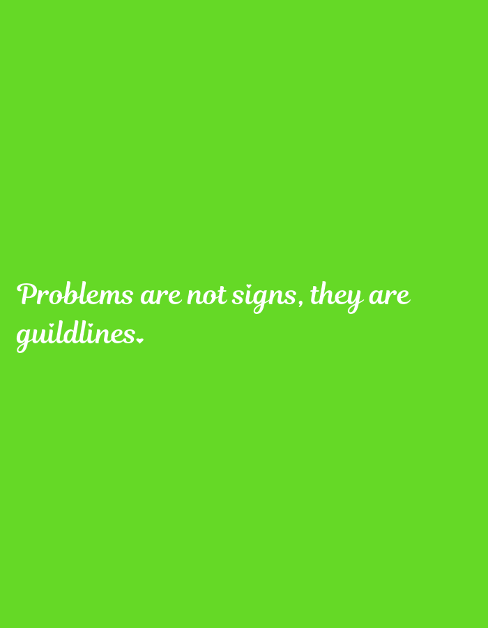 This image displays white text against a solid, vibrant lime-green background. The text reads, "Problems are not signs, they are guildlines." The word "guildlines" appears to be a misspelling of "guidelines." The font is a decorative, cursive script with slightly italicized characters. The text is positioned in the lower-middle section of the frame. No individuals, objects, actions, interactions, or discernible physical environment are depicted. The image offers no visual information to determine a specific location within the city of Maiburiji, Nigeria, or any other geographical area.