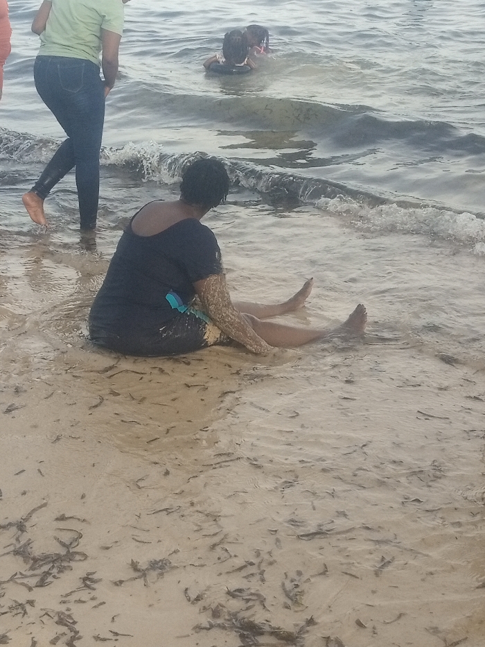 The image depicts a coastal scene in Shanzu ward, Kenya, featuring five individuals near and in shallow water. In the foreground, an individual, appearing to be an adult female with dark hair, sits directly on the wet sand at the water's edge, facing away from the camera. She wears a dark short-sleeved top and dark shorts with a teal pattern; her right arm and upper right leg are covered in light-colored sand or mud. Her bare legs are extended into the shallow water. To the left, a second individual, appearing to be an adult female with light-colored short-sleeved top and dark leggings, stands barefoot in the shallow water, facing partially away from the camera. Further out in the water, two individuals, appearing to be children, are visible wading or playing; one is utilizing a dark inflatable ring. The water exhibits small waves breaking near the shore. The immediate shoreline consists of wet, light-colored sand with scattered dark plant matter or debris. The background horizon and sky are not visible.