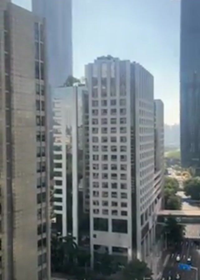 cityscape from an elevated perspective. Several tall buildings of different heights and designs dominate the scene. A multi-lane road with some vehicle traffic runs below, next to a small green space featuring a sculpture. The sky is partly cloudy with the sun shining through. The overall tone is of a modern urban environment.
