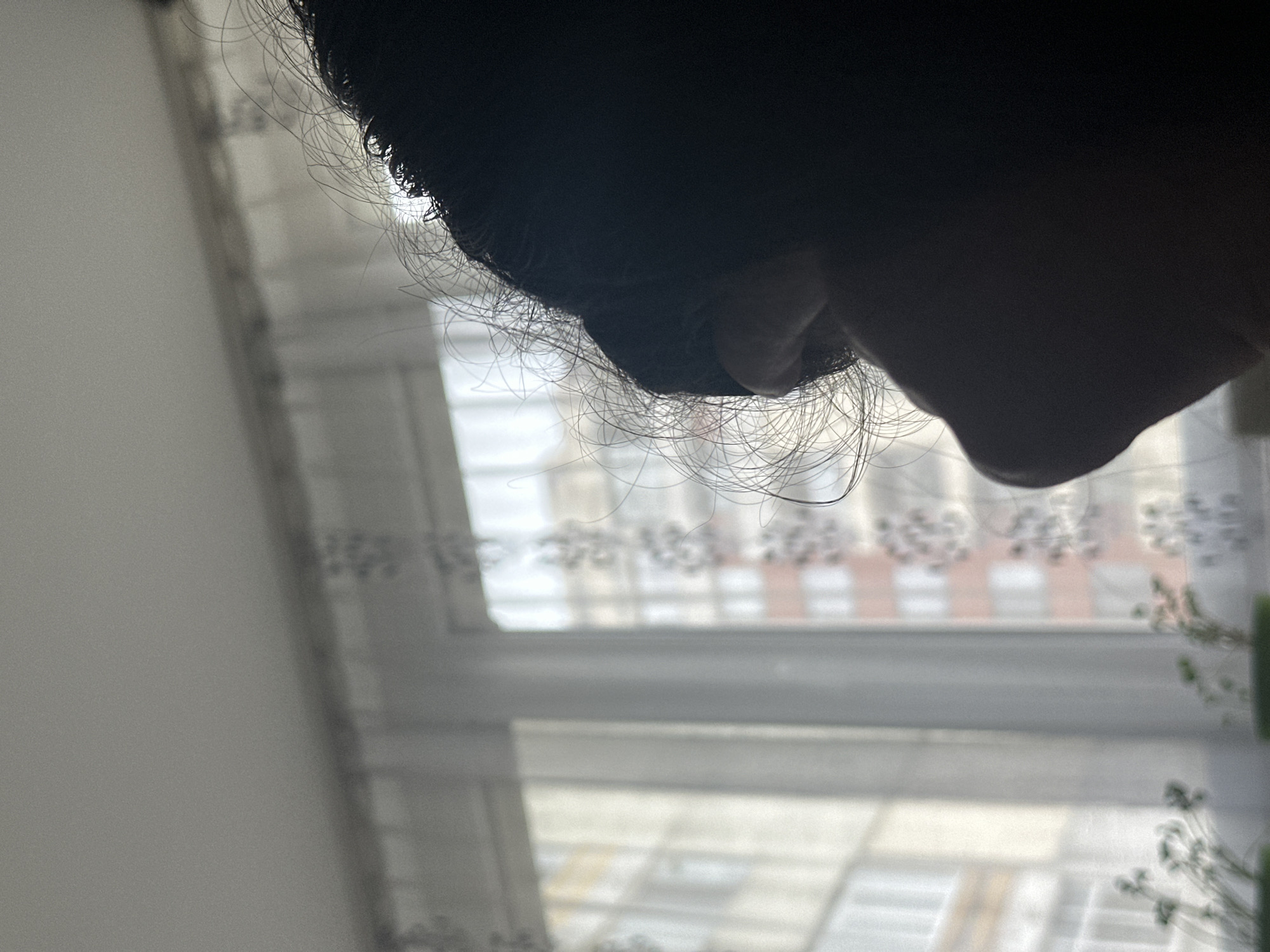 partial view of a person's face, specifically the underside of the chin, jawline, and a portion of the neck. The person has dark hair, with stray strands visible. The background is a window with a sheer curtain. The window frames a view of buildings. The window frames a view of buildings with brick facade of pale color, and it seems there are some apartments in them. The environment would fit for a city. Given the prompt, I could assume that it is in Varna, Bulgaria. There is also a blurry, green object in the lower right of the image, possibly a plant.