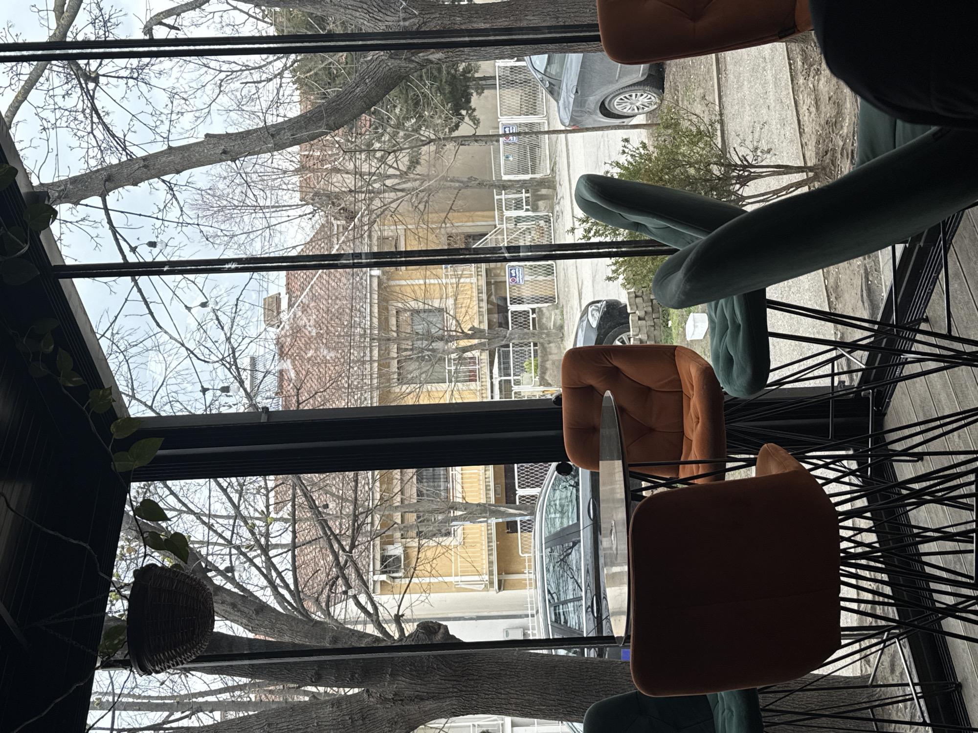 The image captures an interior view from a cafe or similar establishment, looking out through a large glass window onto a street scene in Kumanovo, North Macedonia. Inside, in the immediate foreground, three high-top chairs with distinctive black geometric wire bases are visible: two upholstered in rust-orange and one in dark teal. A round, dark-surfaced high-top table stands between the orange chairs. The overhead structure is dark, from which string lights and green leafy vines are suspended. A dark brown woven hanging basket hangs from the ceiling. The floor consists of light-colored wooden planks. A partial view of a dark garment is visible in the lower right, indicating the presence of an individual out of frame. The exterior scene reveals a street with residential buildings and parked vehicles under an overcast sky, suggesting a cooler season due to the bare branches of numerous deciduous trees. Across the street, a two-story building with a yellow facade, multiple white balconies, and a red tiled roof is prominent. In front of this building, a white metal fence with repeating square patterns and several small, white signs (details unreadable) lines the pavement. A dark-colored sedan is parked on the street to the left, and a grey sedan is visible further down the street to the right. Small green bushes grow near the ground level immediately outside the window.