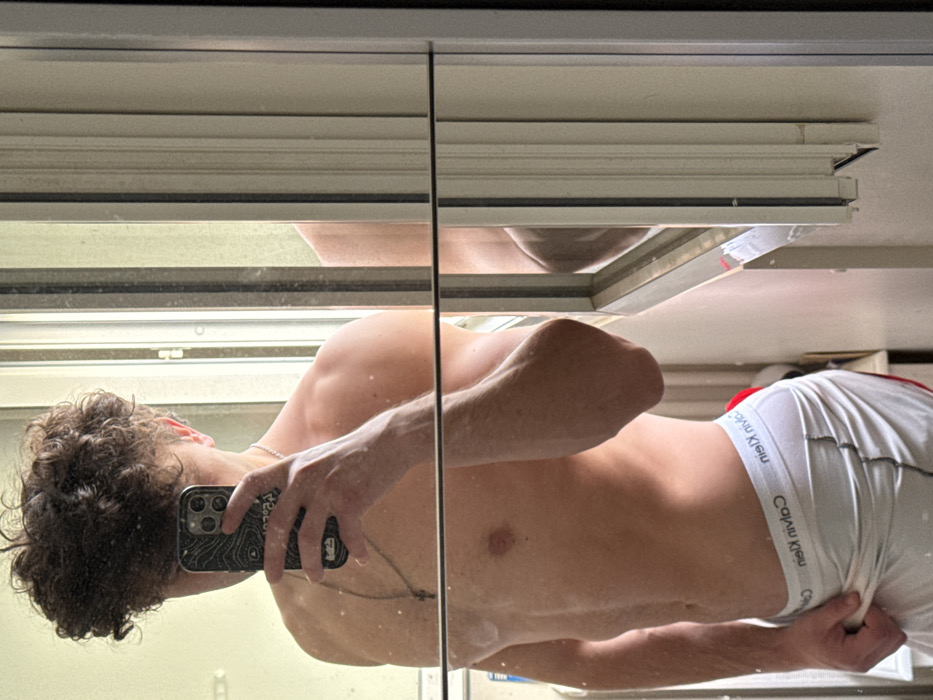 An adult male is depicted from the head to approximately mid-thigh in a mirror selfie, taken in an interior setting in Rennes, France. His face is obscured by an iPhone held in his right hand, which features a dark case with a white topographic map pattern. He has curly dark hair and wears a silver chain with a small crucifix pendant. He is shirtless, displaying a muscular physique. His left hand is positioned to adjust the waistband of light grey athletic shorts, revealing white Calvin Klein brief-style underwear. A red vertical stripe is visible on the outer side of the shorts. The background, visible as a reflection in the mirror, shows a portion of an interior room and the framed opening of a window or door with vertical slats, indicating an external view. A narrow horizontal reflective surface extends across the image at approximately waist height. The illumination appears to be bright, likely natural light.