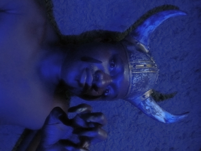 - "A person wears a horned helmet, lying on a textured surface under blue lighting" by FM-ueEo62, licensed under CC BY 4.0