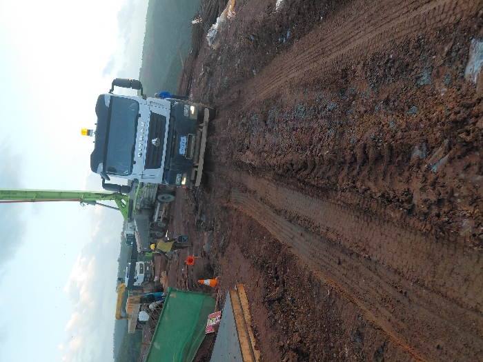 A construction site shows a large white truck traversing a muddy path. Tire tracks are deeply etched into the earth. Further down the muddy track, construction workers wearing yellow hard hats are seen. A green crane boom is visible to the left, along with various construction materials and orange traffic cones. The background includes a hillside with vegetation and scattered piles of construction debris.