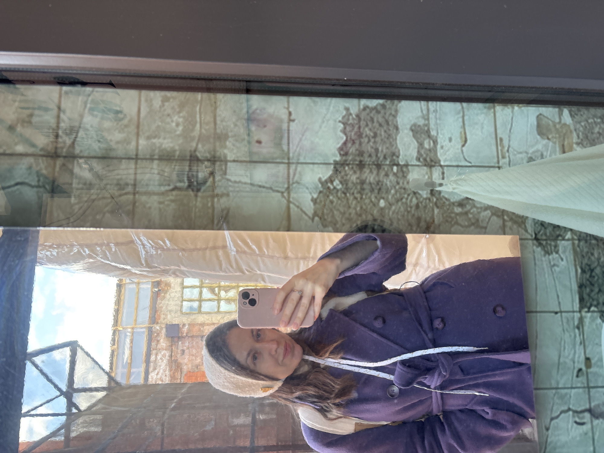 The image displays a waist-up mirror selfie of a female subject, situated within the Sevkabel Port area of Saint Petersburg, Russia. The subject is a woman with medium-length brown hair, captured from the chest up, looking directly into the camera with a slight smile. She wears a beige knitted bonnet with white ties hanging down the front and a small gold-colored embellishment on the left side. Her attire includes a dark purple, double-breasted coat with buttons and a matching belt tied at the waist. Straps of a light-colored backpack are visible over her shoulders. She holds a light pink smartphone, featuring two prominent rear camera lenses, in her right hand to take the photograph. A metallic ring is present on the ring finger of her left hand. The reflection in the mirror behind the woman depicts an outdoor urban environment, consistent with the industrial-turned-creative space of Sevkabel Port. Visible elements include reddish-brown brick buildings, one of which features a multi-paned window. Above these structures, a clear blue sky with some clouds is visible through a prominent glass or transparent plastic roof structure, possibly a skylight or part of a covered passage. Sections of the background buildings are covered with plastic sheeting, indicative of ongoing construction or renovation. The right side of the mirror, beyond the woman's reflection, reveals an indoor tiled wall, appearing light in color with visible grout lines and signs of age or wear. A white towel hangs from a plastic hook adhered to this tiled surface, suggesting the mirror is located within an interior space, such as a restroom or service area, at the specified location. The mirror itself has a dark vertical frame on its right edge.