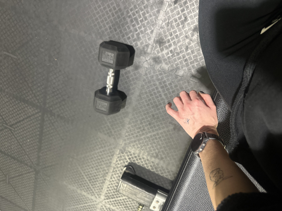 The image depicts an indoor scene within an unspecified fitness facility or gym located in Tunbridge Wells, United Kingdom. The foreground presents a close-up, first-person view showing the lower torso, right arm, and hand of an individual. The person is wearing dark athletic trousers and is seated or resting on a black, textured gym bench, which partially occupies the lower left quadrant. A grey sports watch with a black face is present on the right wrist. The right hand displays dark-painted fingernails and a small star tattoo on the back, while the forearm features a faint, abstract tattoo. On the dark grey, interlocked rubber mat flooring, patterned with a raised diamond plate design, a 12.5-kilogram hexagonal rubber-coated dumbbell with a chrome handle is positioned horizontally in the mid-ground. To the left, partially obscured, a dark-colored protein shaker or water bottle with metallic elements rests on the mat. The lighting indicates an indoor, artificially lit environment. The individual's hand is resting, suggesting a pause in activity.