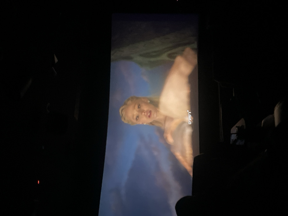 A low-lit, slightly blurry image shows a movie screen in a dark theater