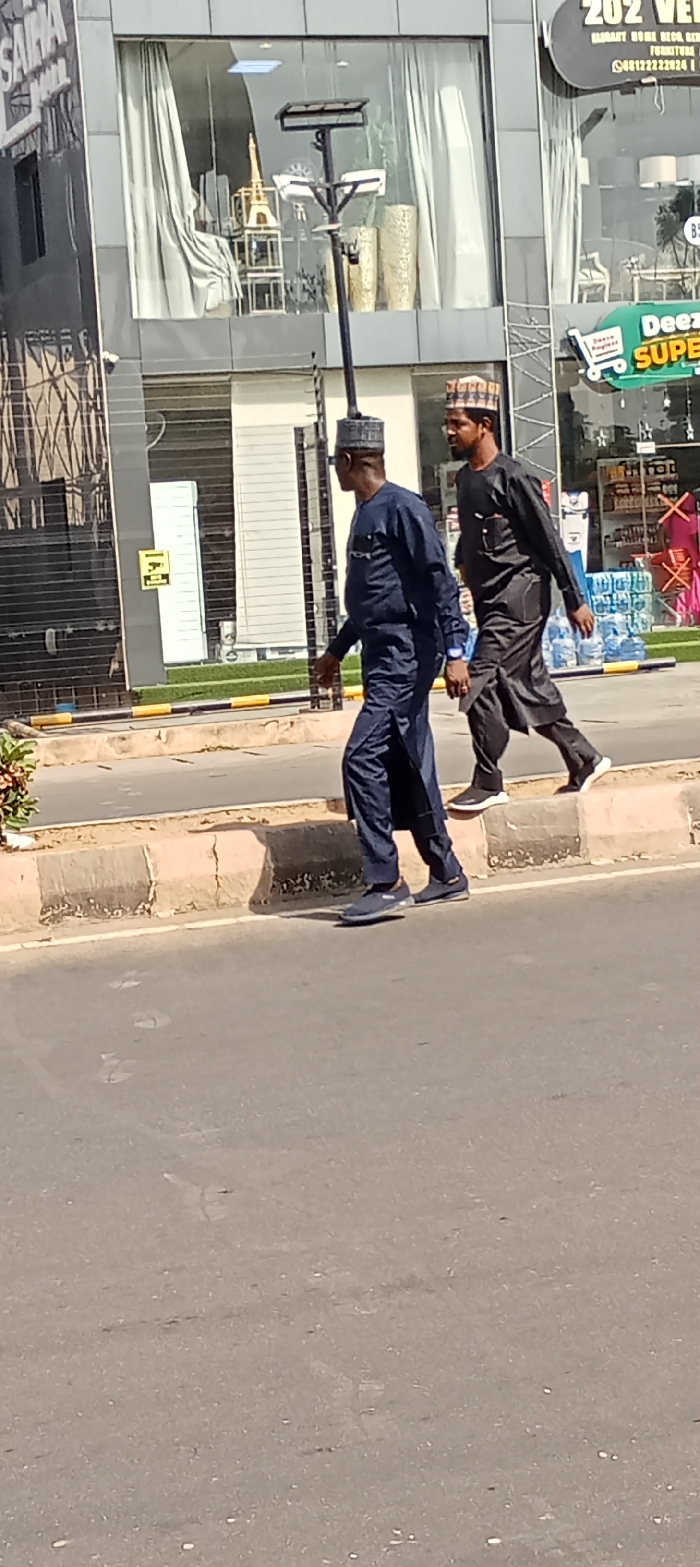 In Kabala, Nigeria, a daylight street scene depicts two adult males walking parallel to a street and sidewalk