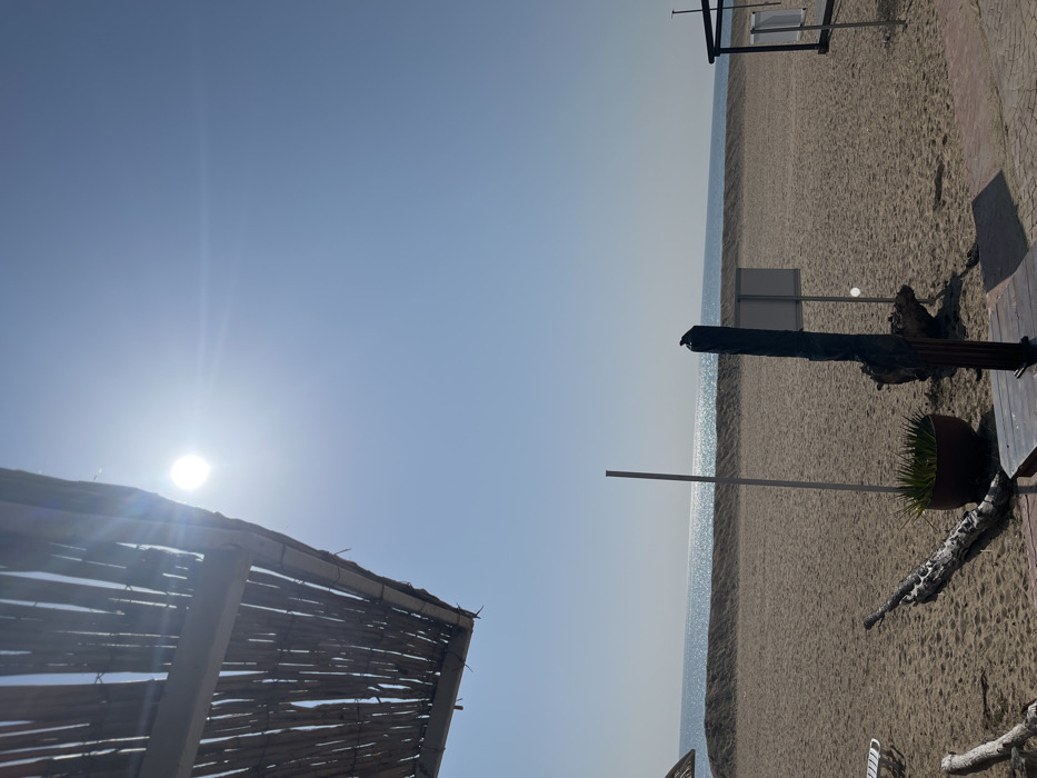 The image presents a sunlit beach scene in Varna, Bulgaria, characterized by a clear, light blue sky. A bright sun, exhibiting lens flare, is positioned in the upper left quadrant of the frame. The perspective is from beneath a thatched or reed-covered awning, visible in the upper left foreground. The central and lower portions of the image feature a wide expanse of light brown sand, extending horizontally towards the horizon. A calm, light blue sea, with visible sunlight glinting on its surface, forms the background. A low, sandy berm or barrier runs parallel to the waterline, separating the immediate beach from the open water. Within the sandy area, several objects are discernible: - A partial white beach lounge chair is visible on the far left. - A tall, slender white pole stands vertically in the left-mid ground. - A dark, irregularly shaped post or sculpture, possibly weathered wood, is situated slightly right of center. A small, dark bird is perched on its apex. - To the left of this dark post, a dark brown planter containing green foliage rests on the sand. - A gnarled piece of driftwood or a similar log lies partially buried in the sand in front of the planter. - Two white, rectangular signs, mounted on poles, are visible further back on the sand, towards the right side of the frame. - A dark-framed structure, possibly part of a beach hut or amenity, is partially visible on the far right. The immediate foreground suggests a slightly raised, possibly paved or decked surface from which the photograph was taken. No individuals are present in the scene.