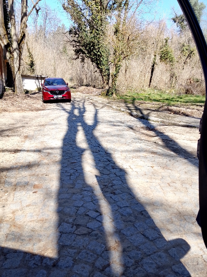 The scene depicts an outdoor environment in Starozagorski bani, Bulgaria, under bright daylight conditions with visible strong shadows. In the foreground, a cobblestone surface forms a path extending into the midground. Two distinct, elongated shadows consistent with human figures are cast onto the cobblestones from the lower center, extending towards the upper midground. A red Mazda CX-5 SUV, bearing Bulgarian license plate "CT 9047 MH," is parked stationary on the cobblestone path in the midground, oriented towards the camera. To the left of the SUV stands a large deciduous tree, mostly bare, behind which a small, light-colored building or shed is partially visible. To the right of the SUV, another tree heavily covered in green ivy or vines is present. The background consists of a dense growth of predominantly bare deciduous trees and brush. Patches of green grass are visible on the right side of the background. A dark, vertical structural element, consistent with a vehicle's interior frame or pillar, is present along the extreme right edge of the image. No individuals are directly visible in the frame, though their shadows are present.