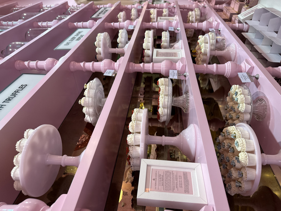This image displays the interior of The Yorkshire Soap Co. store, located in York, United Kingdom. The scene features a wall constructed of multiple horizontal pink shelves, supported by ornate pink baluster-shaped columns. The shelves are densely arranged with numerous small, decorative, cupcake-shaped bath products. These products are presented on various tiered cake stands, made of white ceramic or clear fluted glass. The bath products exhibit different frosting and topping designs, including white frosting with red sprinkles, white frosting with gold accents, and white frosting with subtle blue or light brown floral motifs. A white framed sign on the lower-left shelf explicitly identifies the merchandise as "THE YORKSHIRE SOAP CO. COCOA BUTTER BATH TRUFFLES," providing individual and gift box pricing. Further along the shelves, additional white framed signs are visible; one clearly states "EAT, SLEEP, BATHE, REPEAT," and another partial sign at the top reads "...TH TRUFFLES." Small, striped pricing signs on slender stands are interspersed among the product displays. In the lower right foreground, stacks of open, empty, striped gift boxes are visible. No individuals are present in the image.