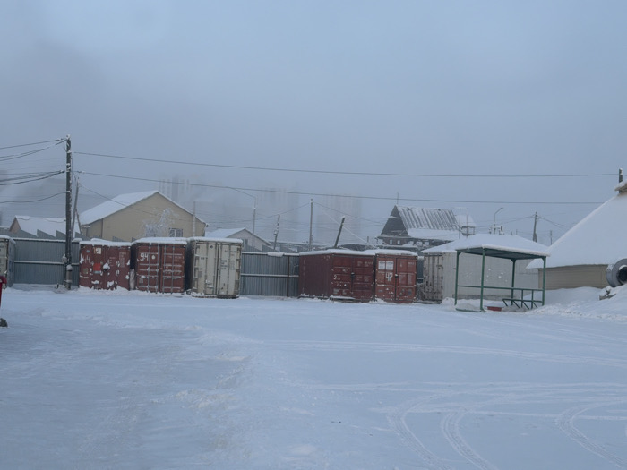 A snow-covered ground reveals a row of shipping containers in red and white hues behind a gray fence. Further back, structures with snow-laden roofs dot the landscape, obscured by a thick fog. A green bus stop with a snowy roof stands to the right. Power lines are visible against the hazy sky. Tire tracks mark the snow-covered foreground, indicating recent movement.