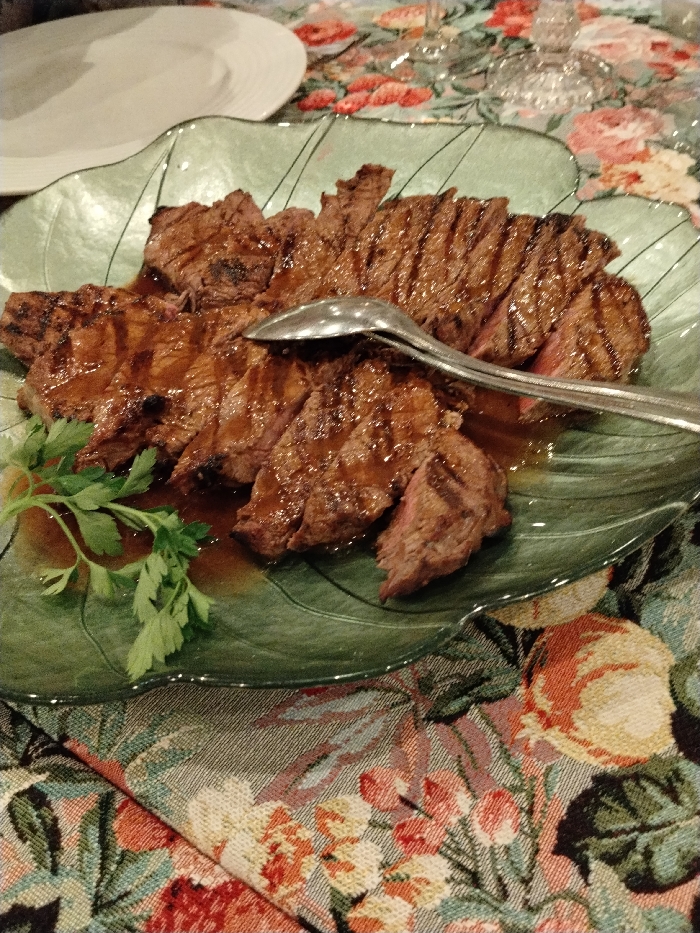 Sliced, grilled steak covered in sauce sits on a light green, leaf-shaped platter. A serving spoon rests on the meat. A sprig of parsley adds a touch of green to the dish. The platter is placed on a table covered with a floral tablecloth. Another plate, presumably also part of the meal, is visible in the upper-left corner. The overall setting suggests a formal or special occasion.