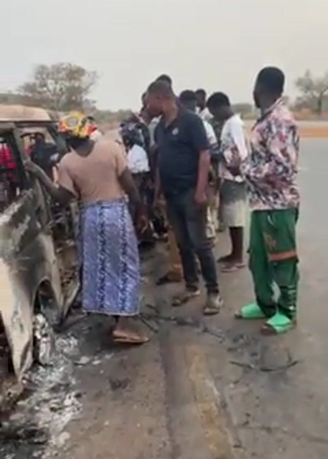burnt-out van on the side of a road. A group of people are standing around the van, looking at it. One woman is reaching into the van. The road is paved and there is vegetation on either side of the road. The weather appears to be hazy.