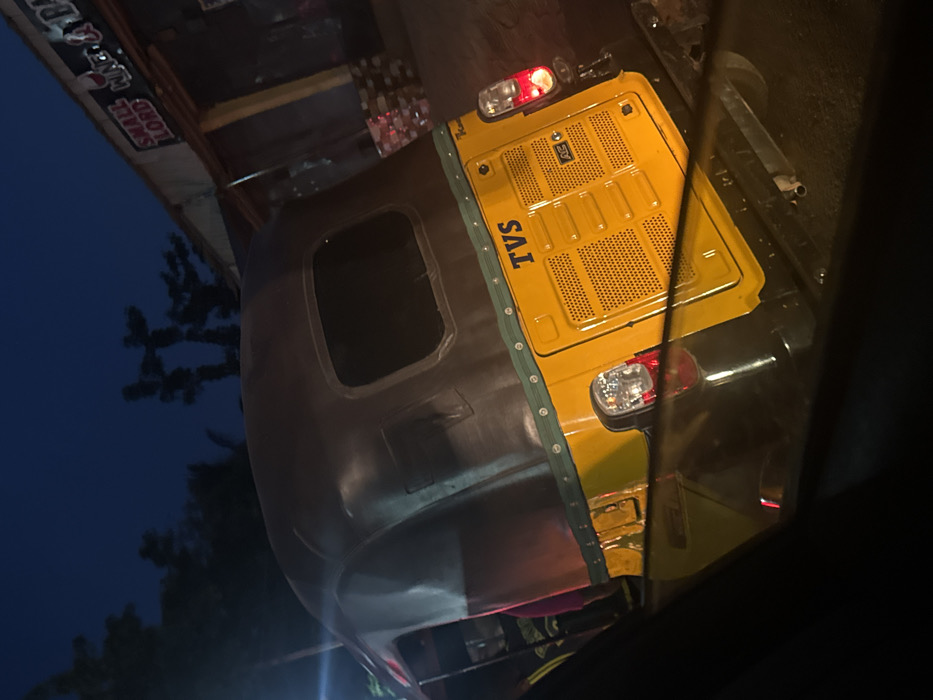 A close-up image shows the rear of a TVS auto-rickshaw at dusk