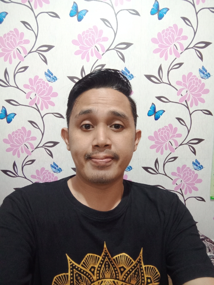A man with dark hair, a mustache, and light skin faces the camera. He wears a black t-shirt with a golden design on the front. The background is a patterned wallpaper with pink flowers, gray leaves, and blue butterflies. The man's expression is neutral. The light appears to be evenly distributed across the scene.