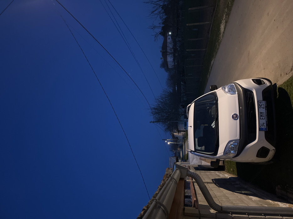 The scene depicts a static, outdoor environment at dusk or early night in Sredkovets, Bulgaria. A white Fiat Fiorino van, displaying a Turkish license plate "34 EMY 251," is parked on the left side of a narrow, paved road, facing slightly towards the viewer. The vehicle's headlights are off. To the immediate left of the van, a light-colored concrete block wall runs parallel to the road, topped by a white gutter and downspout system. Grass is visible between the vehicle and the wall. The road, showing light-colored pavement, extends into the background, curving slightly uphill. To the right of the road, a grassy verge precedes a wire fence with wooden posts, beyond which are numerous bare deciduous trees, indicating a dormant season. In the mid-ground, several single-story residential buildings are discernible among the trees, one exhibiting interior illumination. A single streetlamp illuminates a section of the road further down. Overhead, multiple utility wires are visible against the deep blue, twilight sky. No individuals are present, and no actions or interactions are depicted.