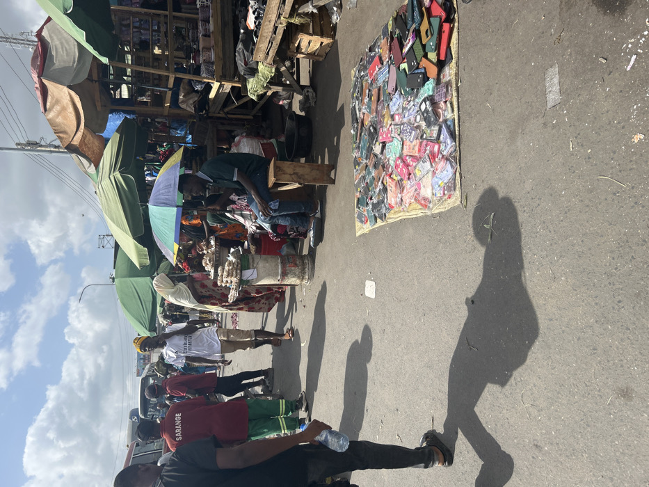 A bustling street market scene showcases vendors under umbrellas and makeshift stalls. A spread of colorful phone cases lies on the ground, possibly for sale. People stroll by, their shadows stretching long in the sunlit street. The chaotic setting suggests a lively and vibrant urban atmosphere.