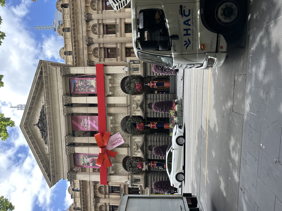 A grand building is decorated with a large red ribbon and bow, resembling a Christmas gift. Banners hang beneath the ribbon, one reading "Merry Christmas Melbourne". Festive wreaths adorn the facade, flanked by decorative planters and nutcracker figures. A white car and a truck with "HAC" and "HONG AUSTRALIA CORPORATION" are parked on the street beside the building. The sky is partly cloudy.