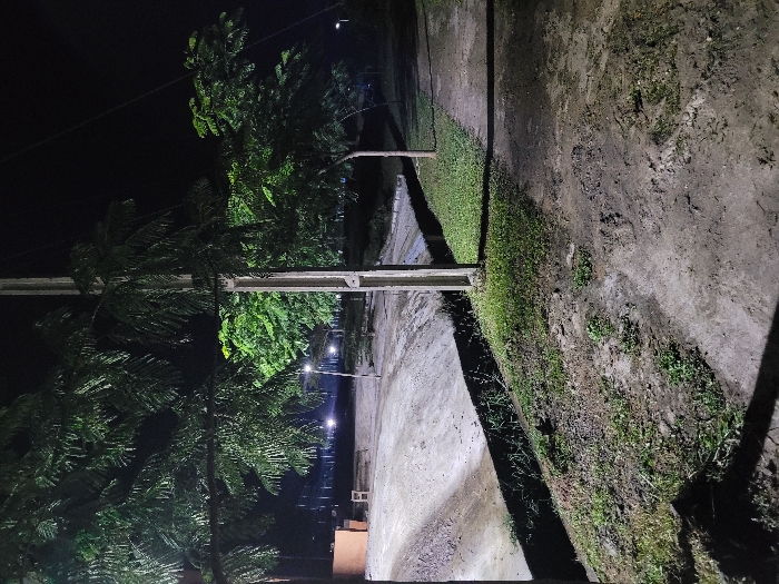 The image displays an outdoor nighttime scene in Abuja, Nigeria. The foreground presents an unpaved, uneven dirt path with scattered patches of green grass and weeds. A light-colored utility pole, appearing to be concrete, stands prominently slightly right of the frame's vertical center, supporting overhead power lines that extend into the dark sky. To the right of this pole, a strip of greener grass borders another dirt track. To the left, a sloping earthen embankment leads down to a broader, unpaved area. In the midground, several trees with green foliage are partially illuminated by artificial light sources. A second, more slender utility pole featuring a light fixture is visible further back on the left side of the wider unpaved area. Adjacent to this area, on the far left, a light brown, cuboid structure, potentially an unfinished building or shed, and a distinct white object, consistent with a plastic chair, are observable. The background consists of a dark night sky punctuated by multiple scattered artificial lights, indicating distant infrastructure or a developed zone beyond the immediate vicinity. No individuals, vehicles, or dynamic actions are depicted within the frame.