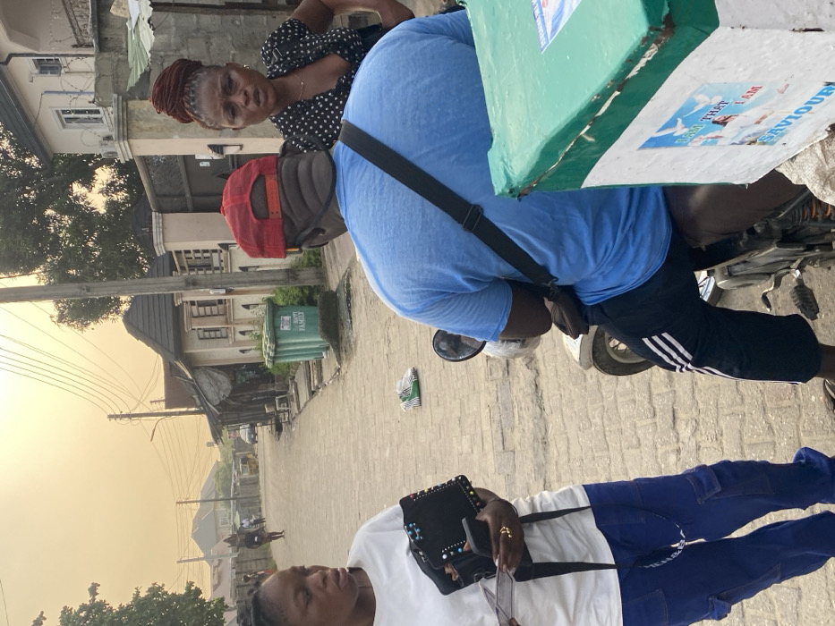 Three people on a street, oriented vertically. A person in a white shirt and blue pants holds a purse and phone. Behind them, a person in a light blue shirt and black shorts sits on a motorcycle with a green cooler attached. Another person in a polka dot shirt is standing behind the motorcyclist. Buildings and trash receptacles are visible on either side of the street. The sky is a golden yellow color.