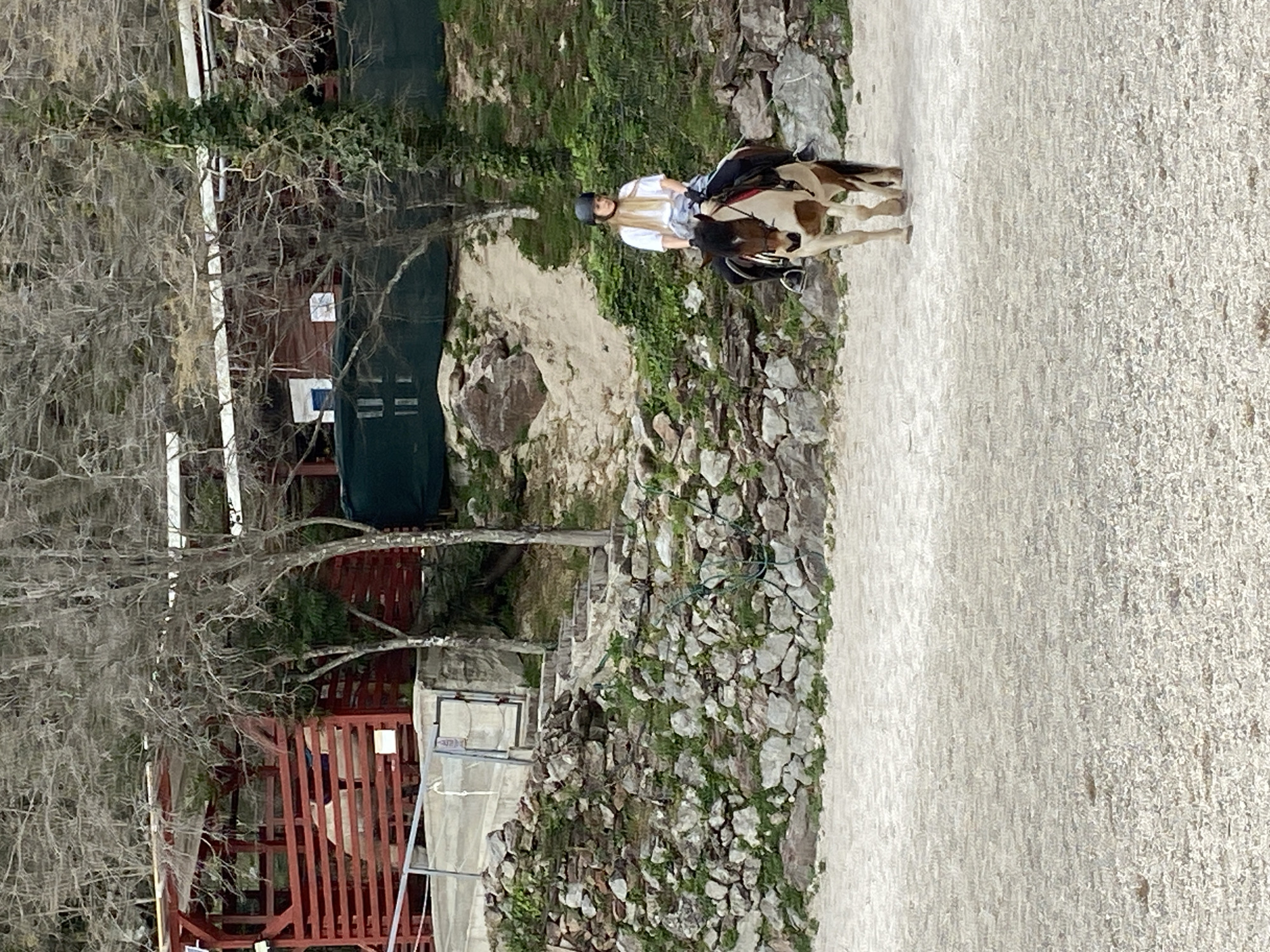 A woman wearing a riding helmet and a white shirt is riding a piebald horse in a rural area of Podostrog, Montenegro. The ground is covered in light-colored gravel or stone. A stone wall covered in moss and greenery is visible alongside the path. Beyond the wall, there is a green net covering a structure. A red wooden building with a white square on its side can also be seen, partially obscured by bare trees.