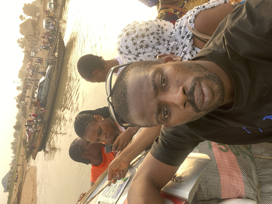 A man takes a selfie in what appears to be a boat or ferry, with other passengers visible in the background. A crowd of people and vehicles, including a car, are visible on land in the distance. The man wears a black shirt and has sunglasses on his head. Two women stand beside him looking at a license plate. The surroundings suggest a riverside or lake setting, with a dusty or sandy shoreline visible on the horizon.