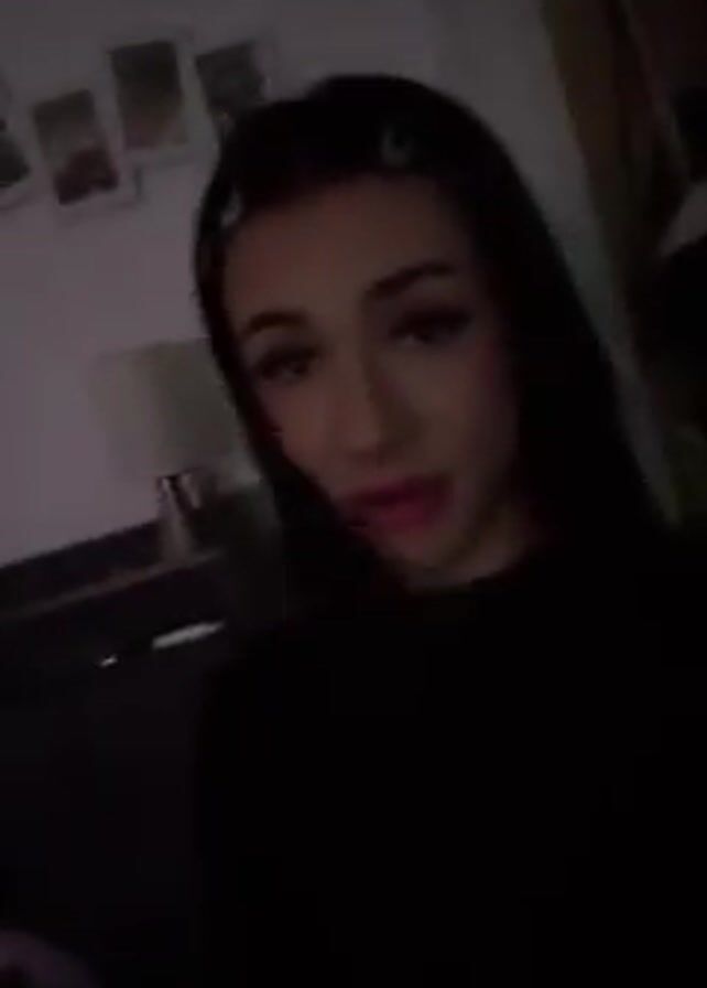 A young woman with dark hair and makeup is filming a video in a dimly lit room