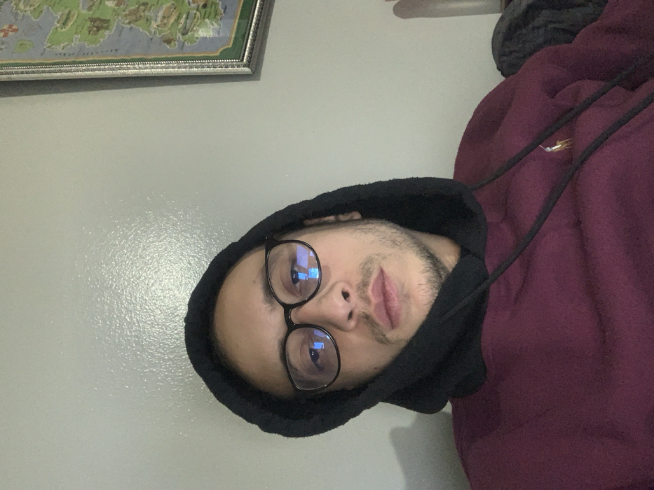 A person with glasses and a black hoodie looks at the camera. He has a beard. The person is wearing a maroon colored sweatshirt with the hoodie. Part of a map in a silver frame hangs on the white wall behind him. The image is rotated.