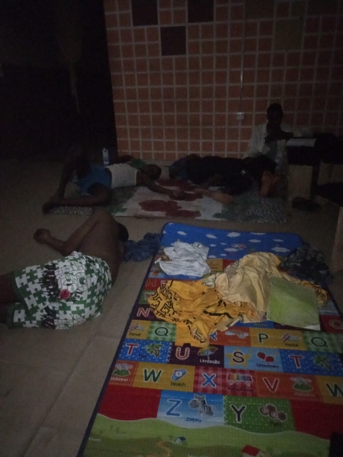 Four people sleep on mats in a dimly lit room. One person sits on a chair by the wall. The room has a tiled wall, and the floor is covered in a beige mat. One mat has the alphabet on it. There is also clothing scattered across this mat. The lighting is poor, and the details are hard to see.