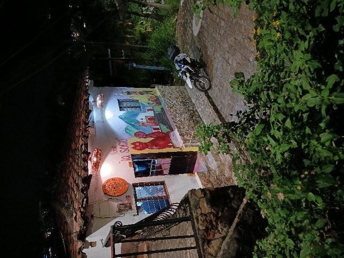A single-story building with a tiled roof has a mural painted on its facade. The mural features mountains, a house, and a red figure. A motorbike is parked along a stone pathway adjacent to the building. Lush foliage frames the right side of the image. The scene is dimly lit, appearing to be taken at night. A decorative light hangs above the mural. A window and a decorative round object are also visible on the building's wall.