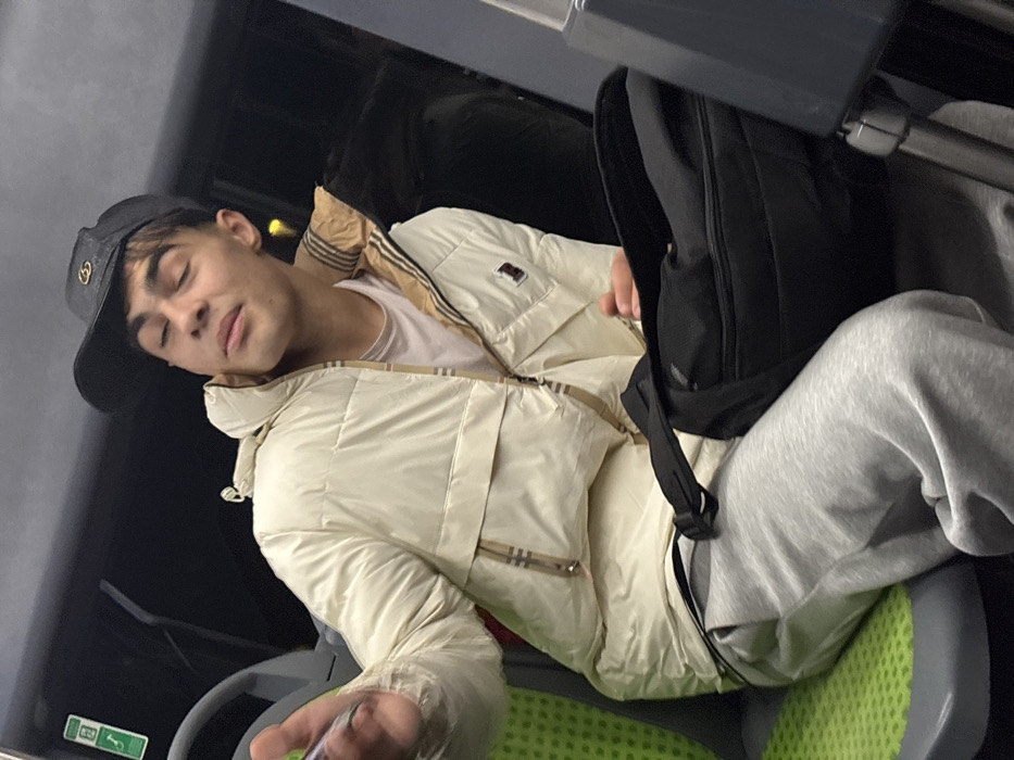 A young man is seated, likely on public transportation