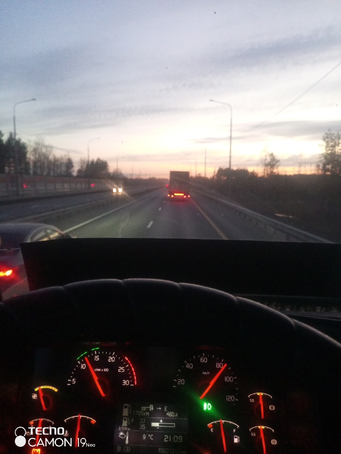 The image depicts a driver's perspective from inside a vehicle on a multi-lane highway in Gorodishchi, Russia, during twilight at 21:09 with an ambient temperature of 9°C. The horizon shows fading daylight with a warm, orange hue transitioning to a cooler grey sky. In the foreground, a black steering wheel is visible, with the illuminated instrument cluster beneath it. The tachometer's needle indicates approximately 1500 RPM. The speedometer shows a speed of approximately 80 km/h. The digital display within the cluster presents information including "1705 KM," "465L," "37," "35," "9°C," and "21:09," alongside an odometer reading of "156213.0." A green indicator light, consistent with dipped headlights or fog lights, is illuminated. Fuel and temperature gauges are also visible, with the fuel level appearing less than half full. On the highway ahead, two lanes are visible in the direction of travel, marked by white lines. Streetlights are present along both sides of the road. A large truck with illuminated red taillights is directly ahead in the same lane. To the left, another vehicle's illuminated taillights are visible, suggesting it is in an adjacent lane or passing. The headlights of oncoming traffic are visible in the opposing lanes. Trees and dark foliage line the sides of the highway in the distance. The vehicle appears to be in motion.