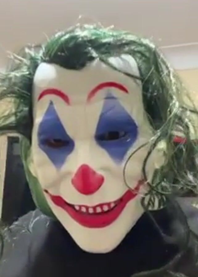 A person wearing a Joker mask and a black turtleneck stands indoors against a plain beige wall and waves. The mask is pale with red lips, a red clown nose, blue diamonds around the eyes, and curly green hair. The room is dimly lit by overhead lights.