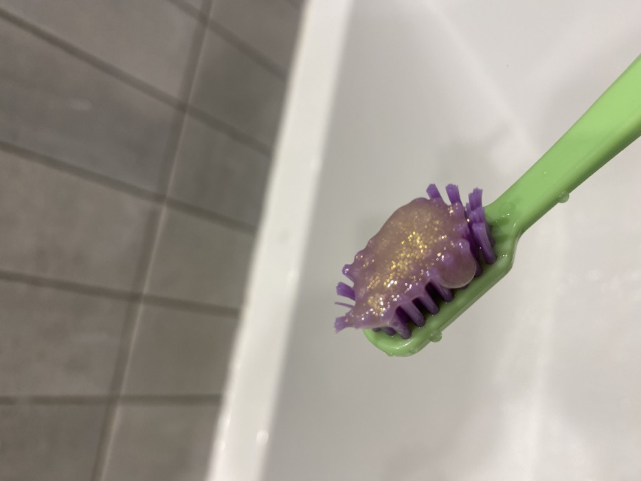- "A green toothbrush with purple bristles holds a dollop of light purple toothpaste speckled with gold glitter" by FM-pez9w2, licensed under CC BY 4.0