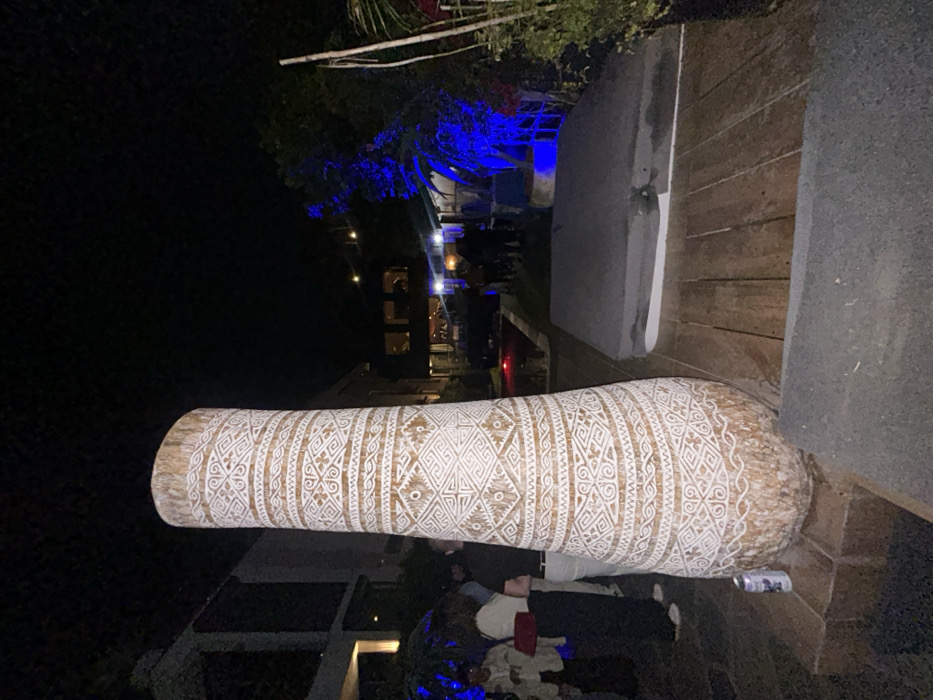 The image captures an outdoor night scene at a social gathering in Santa Monica, United States. A large, light brown cylindrical pillar, appearing to be a carved wooden tree trunk, dominates the foreground and center, featuring intricate white geometric and curvilinear patterns along its length. A blue and white beverage can rests on its dark, stepped base. To the right, a dark wooden deck section holds two large, rectangular dark gray cushions, one stacked upon the other. In the mid-ground, a dark, rectangular water feature, possibly a pond or reflecting pool, is visible, reflecting a subtle red light source. Multiple individuals, approximately 10-15, are gathered in groups on the left and in the background, engaged in conversation. They wear varied attire ranging from casual to semi-formal. A person on the far left is observed holding a red shoulder bag. The background features modern architectural structures, including a building on the left with dark walls and illuminated windows. Various plants and trees are present, with some foliage on the right and in the background distinctly illuminated by intense blue accent lighting. Faint string lights are discernible in the upper background, contributing to the overall dim, artificial illumination of the evening event.