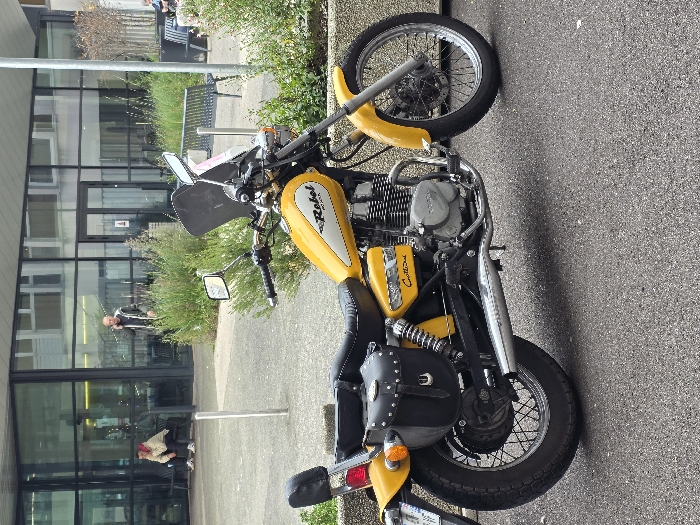 - "A yellow and white Honda Rebel Custom motorcycle is parked on dark grey asphalt pavement in a public space in Rouen, France" by FM-PPRef1, licensed under CC BY 4.0