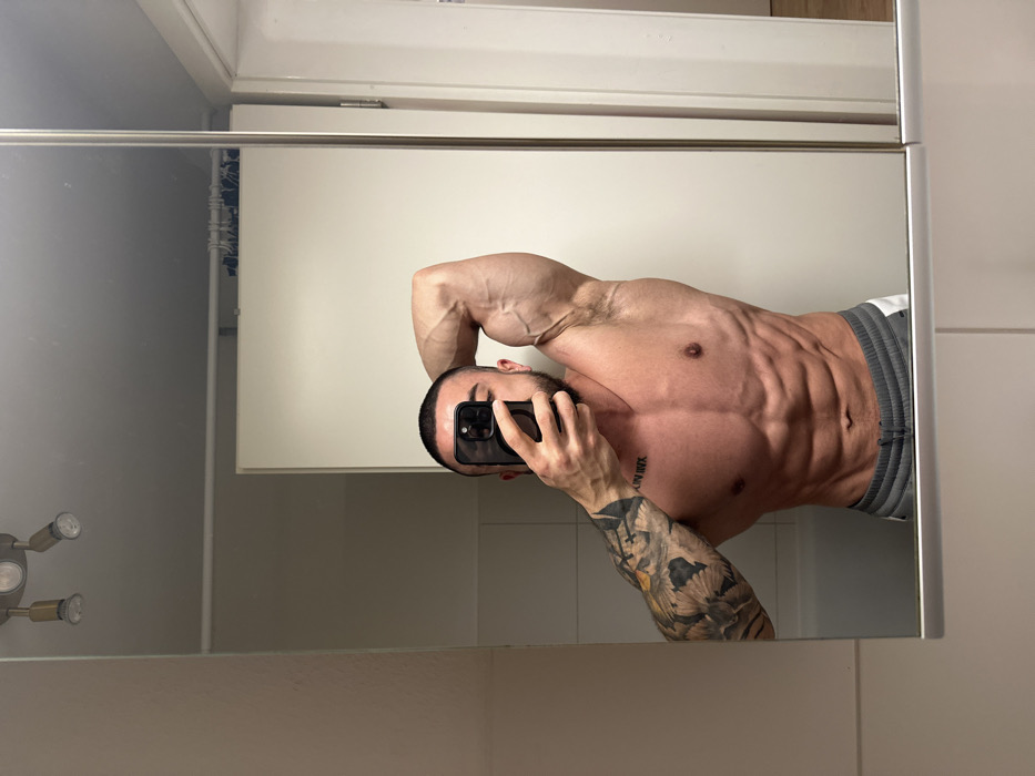 - "An adult male is depicted in a mirror selfie, shirtless, from the mid-chest to below the waist, in what appears to be an indoor bathroom setting" by FM-OaGmh2, licensed under CC BY 4.0