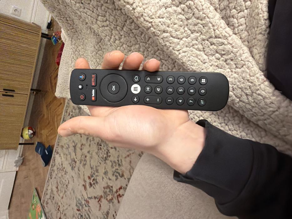 A hand holding a black remote control with several buttons is displayed. Notable buttons include a microphone icon, a gear icon, YouTube, Netflix, OK, a menu-like icon, playback controls, volume controls, number buttons (1-9 and 0), and a button labeled "TL." The hand is positioned against a background of a textured, light-colored blanket or couch. The person wearing the remote is wearing a dark sweater. Part of a wooden piece of furniture is visible in the background.