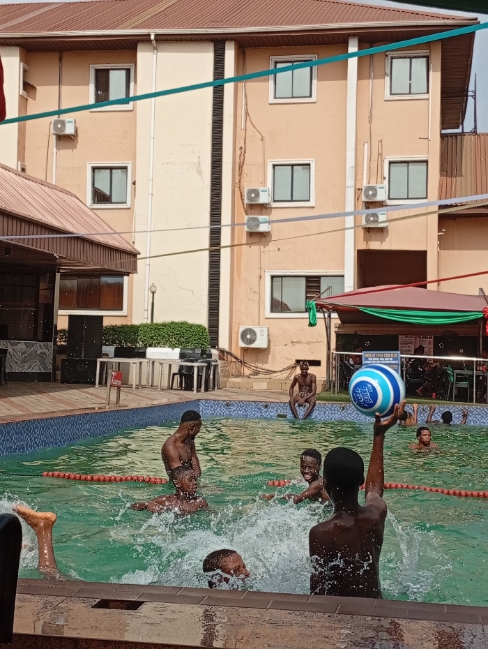 Several people swim in a pool, some splashing and playing. A dark-skinned individual holds a blue and white striped ball overhead, ready to throw. Others are submerged, their faces partly visible above the water. The pool features a blue-tiled edge and a roped divider. Behind the pool, a multi-story building stands with visible air conditioning units and several windows. There's also an open-air bar area adjacent to the pool, with tables and chairs nearby.
