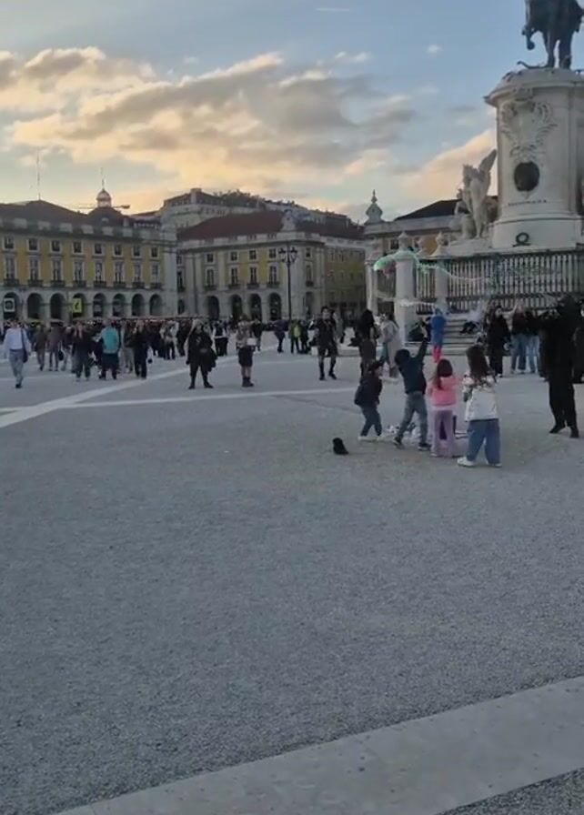 The video captures a scene in a large public square, with numerous people walking around. In the foreground, a man is creating large soap bubbles. Three children are seen running and playing, attempting to catch the bubbles. There is also a pigeon wandering in the square. Behind the children and the bubble-maker, a statue of a man on horseback stands prominently. Buildings with multiple windows line the background. The sky is partly cloudy, suggesting the time of day may be either late afternoon or early evening.