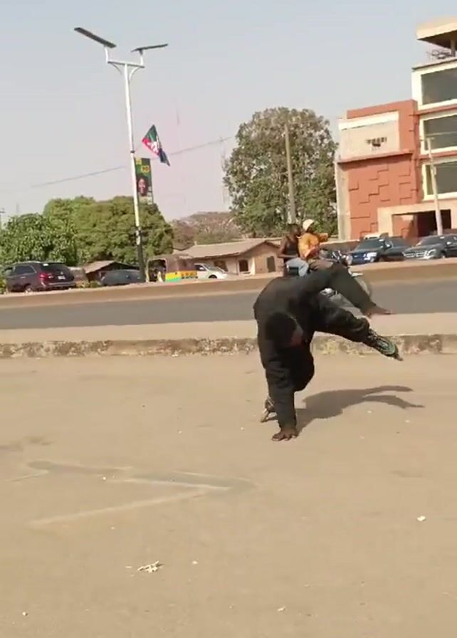 A person is roller skating in an urban environment. They are wearing black clothing and inline skates. The individual performs a push-up and then sits down. The location appears to be next to a road, with passing vehicles and a pedestrian walkway. There are buildings, trees, and street lights visible in the background. A flag on a pole with an advertisement is also present.