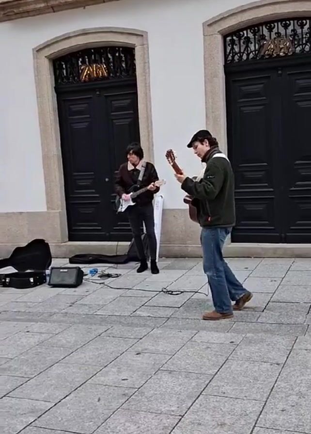 Two men are playing guitars on a stone-tiled street in front of a white building with two black doors. One man is wearing a brown jacket, black pants, and black boots, and he is playing an electric guitar. The other man is wearing a green jacket, blue jeans, brown shoes, and a black cap, and he is playing an acoustic guitar. A black guitar case, a black box, and wires are on the ground near the first man. A person in a blue jacket walks by. The doors on the building say "ZARA".