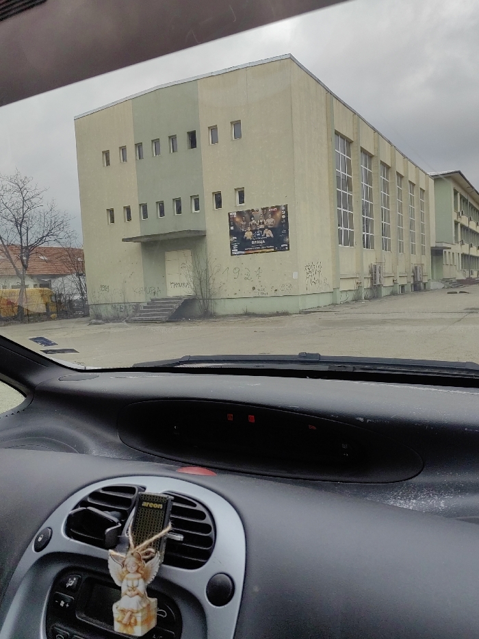The image displays an exterior scene from the interior perspective of a vehicle, looking through its windshield. The foreground shows the dark grey dashboard of the vehicle, including a circular air vent with a metallic trim on the left. An "areon" brand air freshener clip is attached to this vent, from which a small, light-colored ceramic angel figurine holding a basket hangs by a string. The upper dashboard area reveals several red indicator lights. The primary subject in the midground is a multi-story concrete building with a flat roof, featuring a two-tone facade. The left section of the building is painted light green, while the right section and its extending side are yellowish-beige. The left green section contains two horizontal rows of uniformly spaced, small rectangular windows. Below these windows, a small overhang projects over a recessed white double-door entrance, accessible via a set of concrete steps. The lower walls of the building are extensively covered in graffiti, primarily in white and black. A large rectangular banner is affixed to the yellowish-beige facade, depicting multiple figures, likely combatants, and text that includes the Cyrillic word "ВРАЦА" (Vratsa), identifying the location. The right side of the building features large, vertical rectangular windows with white frames. Further to the right, another section of the building, painted a similar light green, extends backward. In the background, to the left of the main building, a bare deciduous tree is visible, along with a partial view of a building with a reddish-brown tiled roof. The ground in front of the main building appears to be an unpaved or dirt lot. The sky is overcast and uniformly grey. The presence of the word "ВРАЦА" on the banner confirms the setting as the city of Vratsa, Bulgaria.