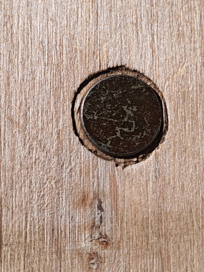 - "In Malo Buchino, Bulgaria, a close-up image depicts a dark, circular metallic object recessed into a light brown wooden surface" by FM-QvdPC2, licensed under CC BY 4.0